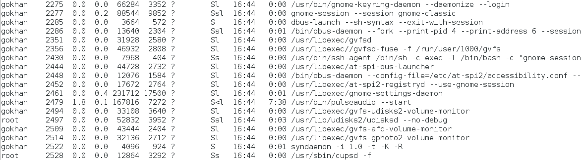 Burada gördüğünüz uygulamalar linux de arka planda çalışan ve sizin açtığınız uygulamaları göstermektedir. Herhangi bir sebebten kitlenmiş olan uygulamayı PID nuarasına bakarak ”kill PID_numarası” yazarak sonlandırabilirsiniz.