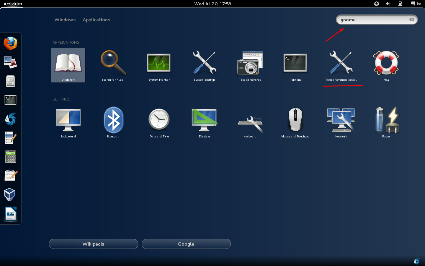 search alanına gnome yazarak çıkan sonuçlardan Tweak Advanced Settings uygulamasını çalıştırıyoruz.