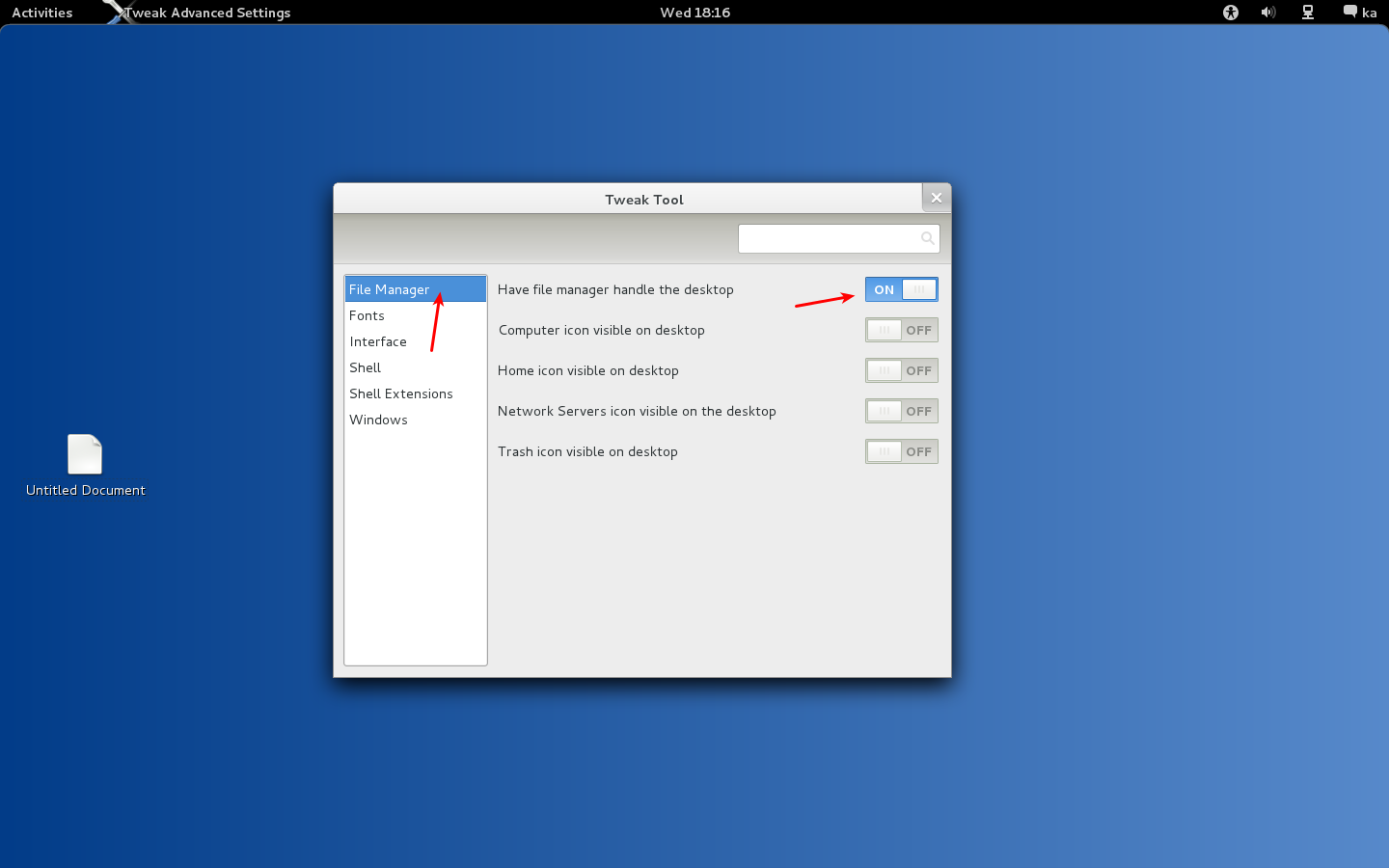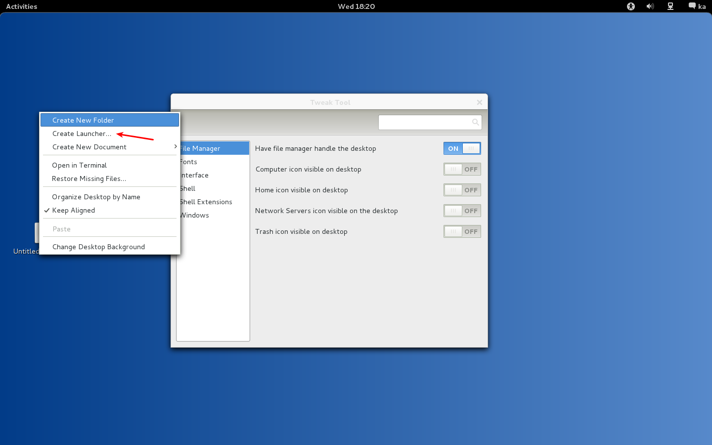 File Manager sekmesinden Have file manager handle the desktop seçeneğini ON konumuna getirerek Gnome 2.x de olduğu gibi Create New Document, Create New Folder vb. seşenekleri aktif etmiş oluyoruz.