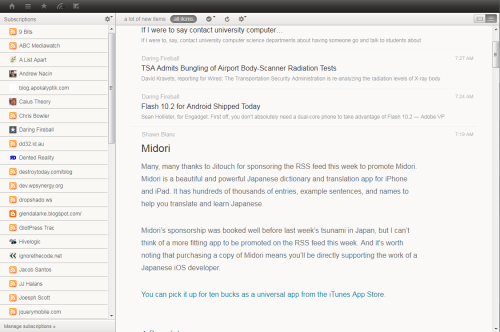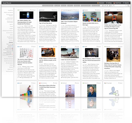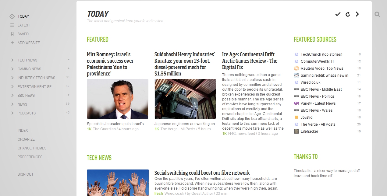 Haber rss lerini takip edebileceğiniz, kullanıcı arayüzü oldukça güzel olan bir site. Ayrıca Google Reader dan aldığınız OPML dosyasını yüklemenize imkan veren bir site. En önemli eksiği mobil arayüzü yada mobil uygulamasının olmaması. Bu yüzden bir süre kullandıktan sonra tekrar feedly’e dönmek zorunda kalmam oldukça üzücü bir durum. Ayrıca çok fazla RSS kaynağınız varsa, sitenin yüklenmesi oldukça zaman almakta.
