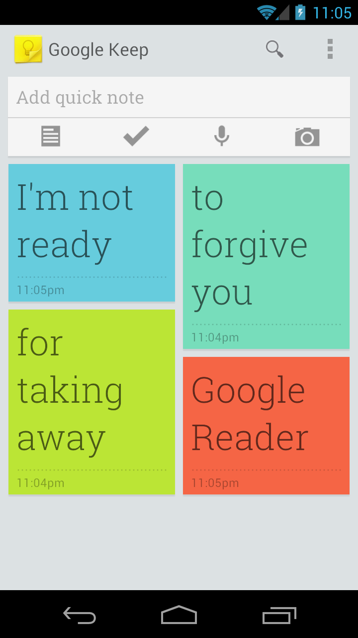 Google birçok servisini zaman içerisinde kapatmıştır. Ama insanlarda google reader gibi çok kullandığı bir servisi kapatması hayal kırıklığına sebebiyet verdi ve google’a kendi Google Keep üzerinden güzel göndermeler yapmaya başladılar. Ayrıca Google Reader’ın kapanmaması için siteler[1] yapmaya başladılar.