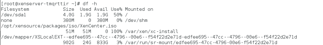 Karşımıza 3 tane mount edilmiş dosya sistemi geldi.Bunlardan ilki olan /dev/sda1 XenServer’ın sistem dosyalarının yüklü olduğu kısmı gösterir. Dosya sistemi none olarak görünen XenServer’ın XenServer Tool denen XenCenter ile VDS arasında, işlemci,ram vb bilgileri görebileceğiniz programı kurabilmeniz için iso olarak mount edilmiştir. 3. ve bizim iso dosyalarımızı burada tutacağımız, dosya sistemi olarak /dev/mapper/XSLocalEXT şeklinde devam eden, XenServer kurulumunda local storage olarak eklediğimiz, boyut olarak en büyük olan, fiziksel disklerin mount edildiği dosya sistemidir.